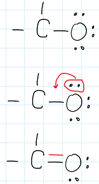 In this example C has only 6e-. When the red bond below between C and O is shared, both C and O is surrounded by an octet.